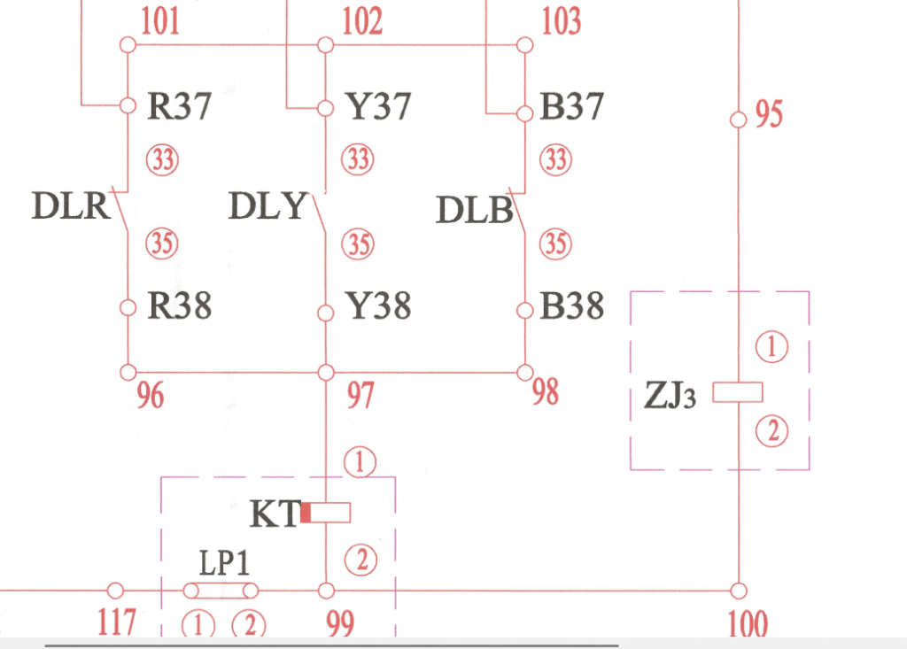 And, DL are breaker auxiliary contacts. DLR for phase R, DLY for phase Y, and DLB for phase B. The above three contacts(between 30 and 32) are normally open contacts, and the lower three contacts(between 33 and 35) are normally closed.